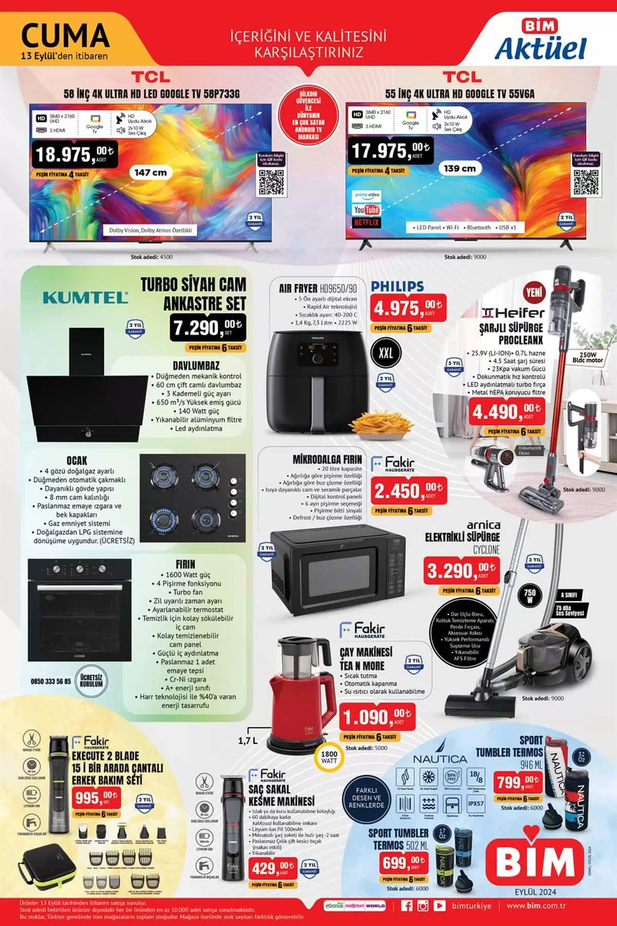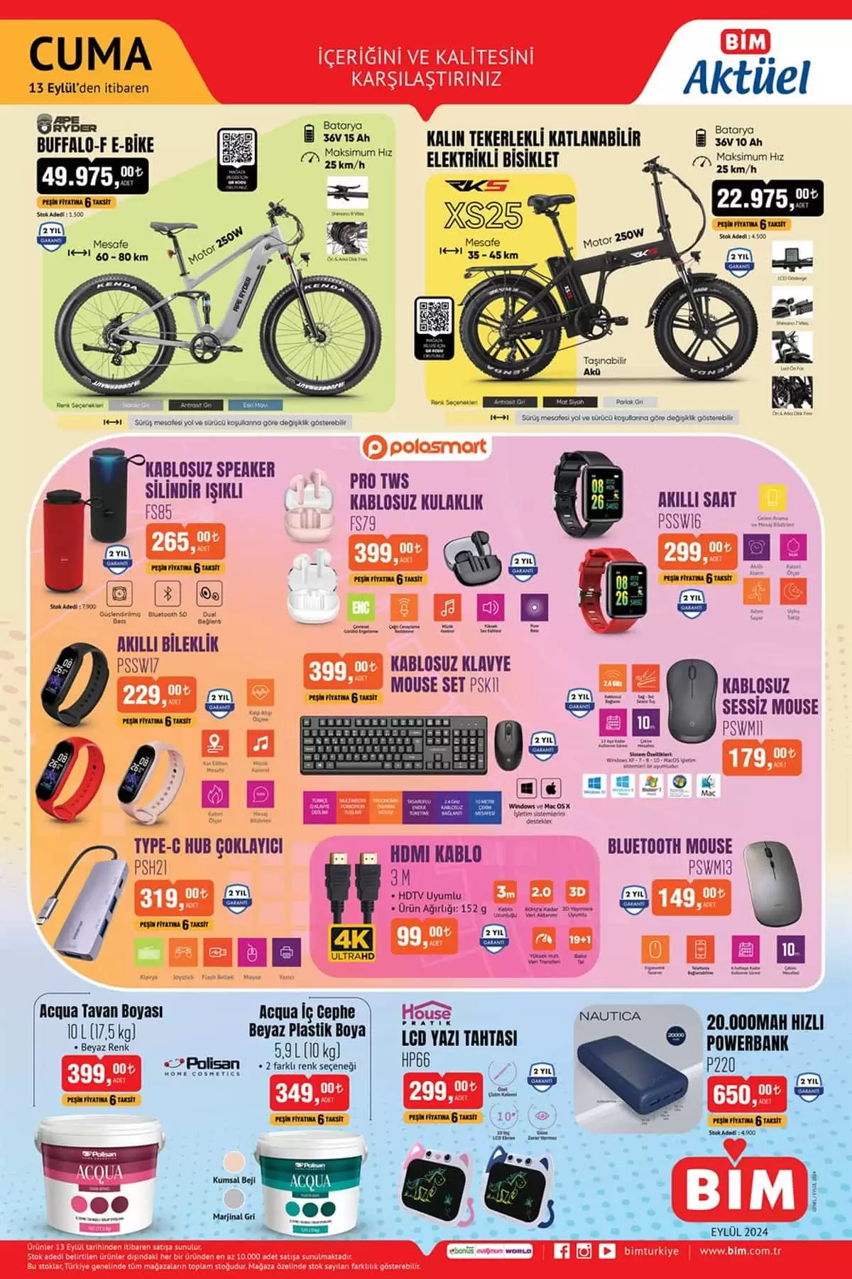 Bim 13 Eylül 2024 aktüel kataloğunun kampanya detaylarında yer alan yeni döneme ait fırsat ürünlerinin nelerden oluştuğunu incelemesine başladığımızda bu haftada Bim Market kmanya farkıyla Kalite ve İçeriği ile muhteşem ürünlerle hazırlanmış olan Bim Aktüel Kataloğu ile karşılıyoruz. Bu Cuma Bimde indirimde neler var? sorusunun merak ettiğiniz tüm cevaplarını bulacağınız 13 Eylül 2024 Bim Kataloğu yeni ürün gruplarında bu hafta; Elektronik Ürünler, Teknoloji Ürünleri, Elektrikli Bisikletler, Beyaz Eşya, Elektrikli Ev Aletleri, Elektrikli Kişisel Bakım Aletleri, Züccaciye ve Mutfak, Tekstil ve Giyim, Ev Eşyaları ve Oyuncaklar olduğunu görüyoruz. Yeni Bim aktüel ürünler kataloğu olan 13 Eylül 2024 Cuma tarihli kataloğun ilk sayfasında ise; 2 yıl garantili 4K smart teknoloji google işletim sistemli dolby vision ve dolby atmos özelliği ile ön plana çıkan TCL 58″ İnç 4K Utra HD Led Google Tv 18,975 TL. Google tv özellik ve bir çok uygulamaya sahip olan led panel, wifi, bluetoothlu TCL 55 İnç 4K Ultra HD Google TV 17,975 TL. Yeni Bim Kataloğu ile muhteşem ürünlerin bir araya geldiği 13 Eylül 2024 Bim aktüel kataloğu içerisinde ki ürünleri incelemeye devam ediyoruz. Bim Kampanya avantajları ile 2 yıl garantili olarak satışa sunulacak olan Polosmart Kablosuz Işıklı Silindir Speaker 265 TL. Polosmart Akıllı Saat 299 TL. Polosmart Akıllı Bileklik 229 TL. Polosmart Kablosuz Klavye Mouse Set 399 TL. Bu Cuma Bim’de indirim reyonlarında yer alacak 13 Eylül 2024 Bim Kataloğu fırsat ürünleri devamında; Buffalo-F E-Bike 49.975 TL. RKS XS25 Kalın Tekerlekli Katlanabilir Elektrikli Bisiklet 22.975 TL. bu fırsat ürünleri Bim Kampanya avantajları ile 20 Eylül 2024 Cuma gününe kadar satışa sunulacaklar.
