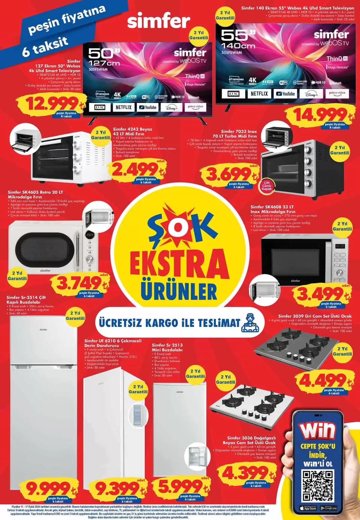 Şok 11 Eylül 2024 aktüel kataloğunun özenle hazırlanan kampanya detaylarında bu haftada Haftanın Fırsatlarını Şok Seviyoruz ve Şok Ekstra Ürünler etiketi ile bir çok kategoride Şok Market farkıyla sizlere sunulacak Şok Aktüel Kataloğu ürünleri göz dolduruyor. Şok Mağazalarının indirim reyonlarında 18 Eylül 2024 Çarşamba tarihine kadar geçerli olacak yeni dönem 11 Eylül 2024 Şok Kataloğu içerisinde yer alan ürün gruplarında; Elektronik Ürünler, Beyaz Eşya, Elektrikli Ev Aletleri, Spor ve Egzersiz Aletleri, Ofis Eşyaları, Helly Hansen markası ile Giyim Ürünleri ile Temel ihtiyaç grubundan seçili ürünleri bu haftanın kampanya listesinde yer aldığını görüyoruz. Yeni Şok aktüel kataloğu olan 11 Eylül 2024 Çarşamba kataloğunun ilk sayfa detaylarında 2 yıl garantili ücretsiz olarak teslimat avantajlı exxen, netflix, youtube, prime video özellikli, webos işletim sistemli Simfer 50″ 127 Ekran Webos 4K UHD Smart Televizyon 12,999 TL. Simfer 55″ 140 Ekran Webos 4K UHD Smart Televizyon 14,999 TL. bu muhteşem elektrinik ürünleri yine kredi kartına peşin fiyatına 6 taksit imkanı ile Hem Şok’ta Hemde Cepte Şok’ta ücretsiz kargo ile satışa sunulacaklar. Çarşamba gününden itibaren geçerli olacak kredi kartına peşin fiyatına taksit avantajı ile satışa sunulacak olan 11 Eylül Şok aktüel kataloğunda beyaz eşya grubunda; 2 yıl garantili Simfer Çift Kapılı Buzdolabı 9,999 TL. Simfer 6 Çekmeceli Derin Dondurucu 9,399 TL. Simfer Mini Buzdolabı 5,999 TL. indirimli fiyatlarla ücretsiz kargo avantajları ile ilk sayfada yer bulmuş satışa sunulacak 11 Eylül Şok Aktüel Ürünleri diyebiliriz. Şok Katalog Bu Hafta 11 Eylül kampanyalarında Mutfak grubunda yine Simfer markası ile 2 yıl garantili Simfer 3039 Gri Cam Set Üstü Ocak 4,499 TL. Simfer 3036 Doğalgazlı Beyaz Cam Set Üstü Ocak 4,399 TL. lik indirimli fiyatı ve kredi kartına peşin fiyatına 6 taksit avantajı ile 18 Eylül 2024 tarihine kadar alabileceksiniz.